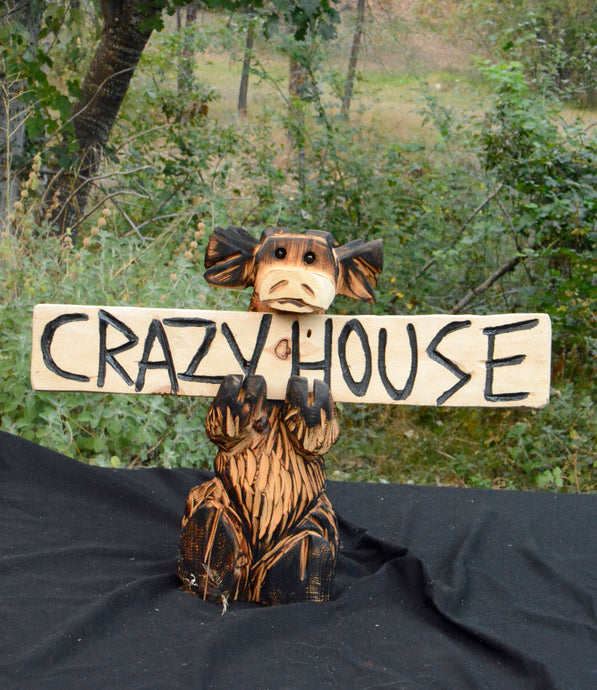 Fun Chainsaw Carved 16" Sitting Moose with "Crazy House" Sign Wood Sculpture |Original One-Of-A-Kind Artwork | Artist & Carver Jess Alice