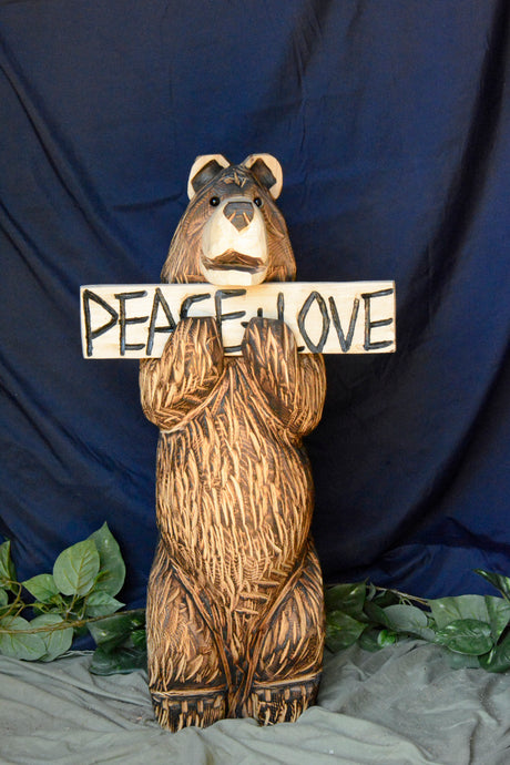 2ft Chainsaw Carved "Peace & Love" Sign Bear Wood Sculpture | Raw California Cedar | One-Of-A-Kind Original Artwork | Artist & Carver Jess Alice