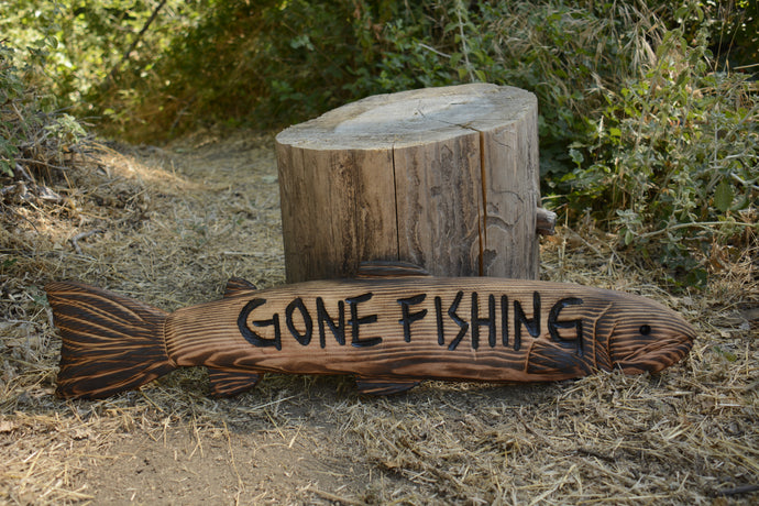 Chainsaw Carved "Gone Fishing" Wall Mount Fish Sculpture | 24" Wall Hanging Chainsaw Carving from California Cedar Wood | Artist & Carver Jess Alice