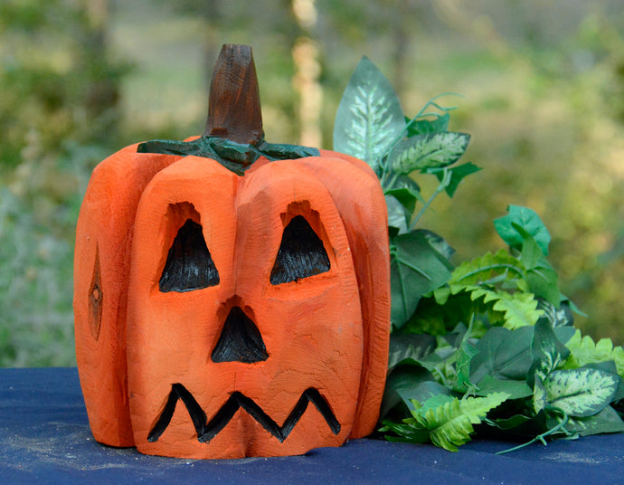 Chainsaw Carved Jack-O-Lantern Pumpkin | 17" 3D Painted Chainsaw Carving | California Cedar Original One-Of-A-Kind Artwork | Artist & Carver Jess Alice