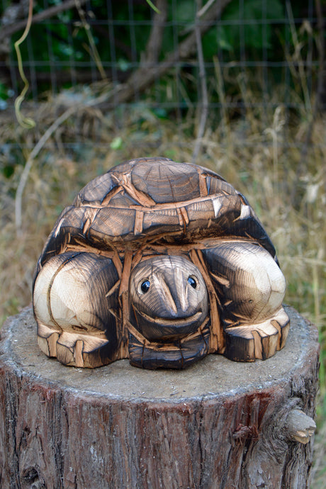 Chainsaw Carved Tortoise Wood Sculpture | Raw California Cedar | One-Of-A-Kind Original Turtle Artwork | Artist & Carver Jess Alice