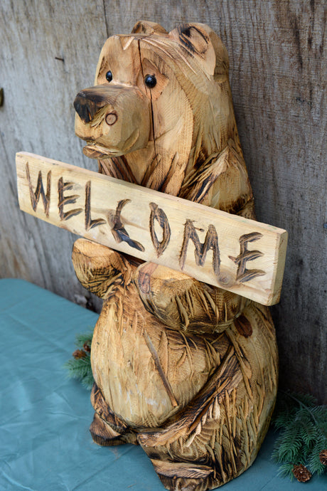 2ft "Welcome" Sign Bear Chainsaw Carving Sculpture | Raw California Cedar Wood Carved Artwork | Artist & Carver Jess Alice