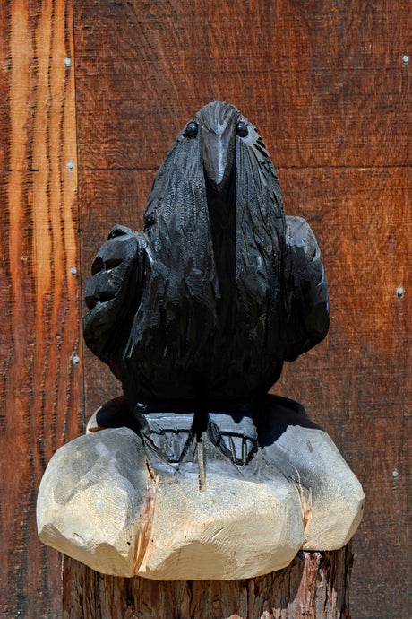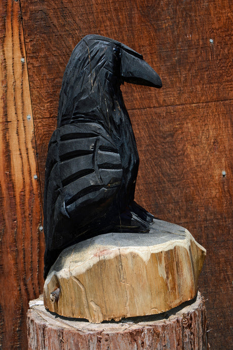SOLD Raven on Stump Sculpture | 20"x10" Chainsaw Carving | California Cedar Wood | Painted & Sealed | Artist & Carver Jess Alice