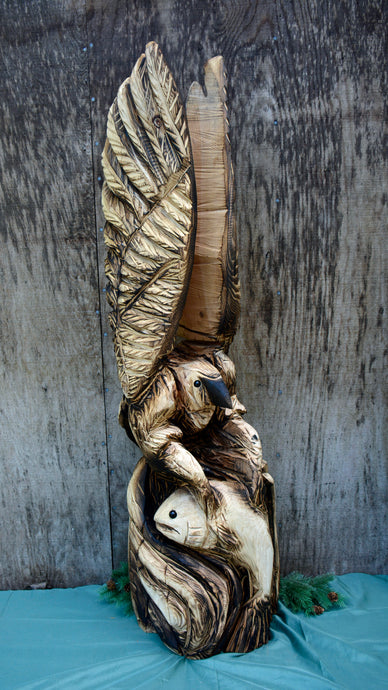 3ft Bird with Wings Out, Fish in Talons | California Cedar Chainsaw Carved Wood Sculpture | Artist & Carver Jess Alice