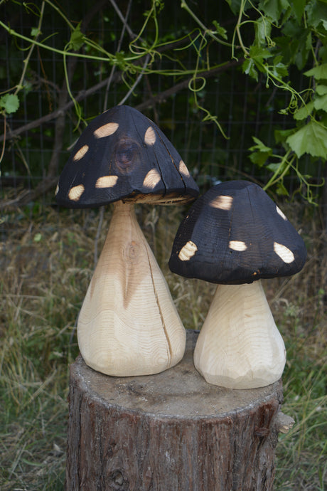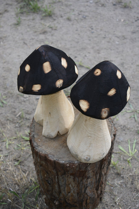 2 Tier Chainsaw Carved Mushroom Sculpture Set | California Cedar Wood Carved Artwork | Artist & Carver Jess Alice
