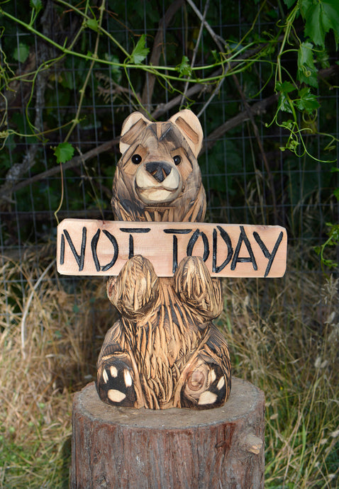 Chainsaw Carved 19" Sitting Bear with "Not Today" Sign Wood Sculpture |Original One-Of-A-Kind Artwork | Artist & Carver Jess Alice