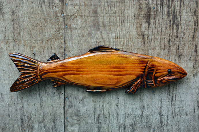 Wall Mount Fish Sculpture | 31"x 9" Wall Hanging Chainsaw Carving | California Cedar Wood Carved & Sealed | Artist & Carver Jess Alice
